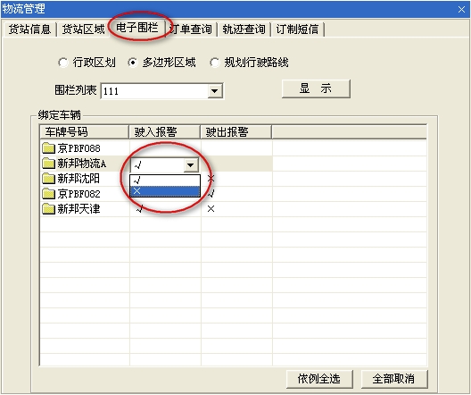 点击“驶入报警”“驶出报警”或“记录出入”空白处,即弹出选择栏: