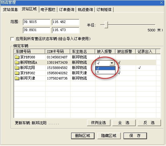点击“驶入报警”“驶出报警”或“记录出入”空白处,即弹出选择栏: